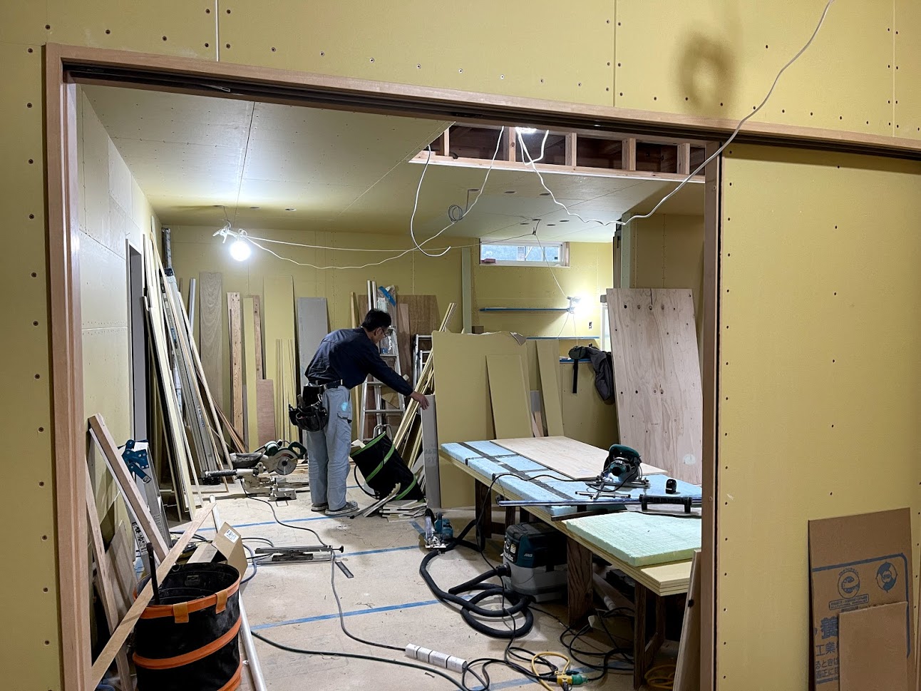 大工工事も大詰めで各種資材が所狭しと並べられています