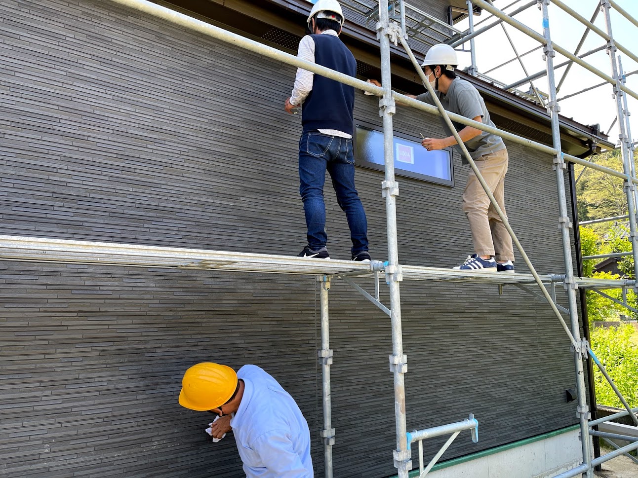 黒い外壁や色のついた軒天ボードはどうしても汚れが目立ちます。なので、各自濡れタオルを片手に現場チェックをしました。