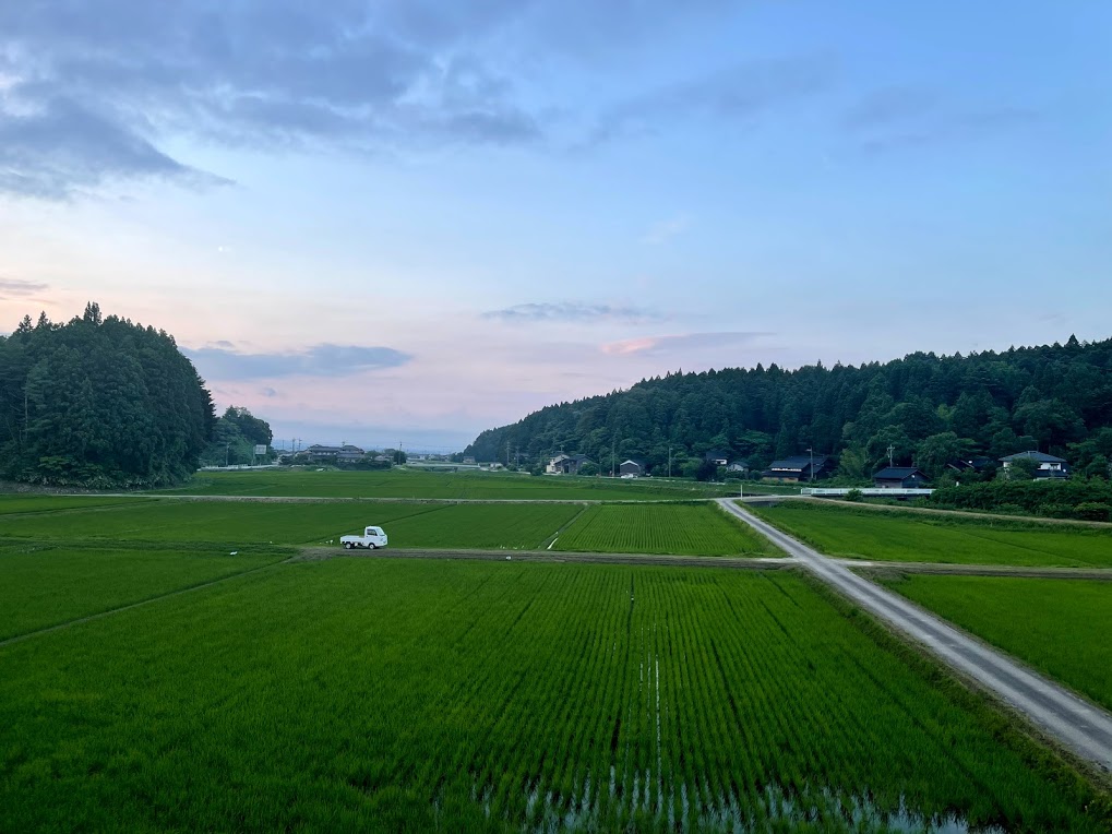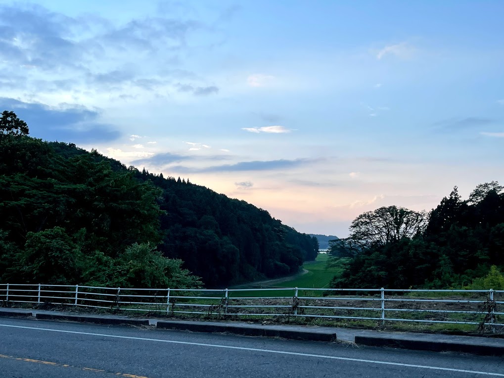 遠くに見える赤浦潟とその上空の綺麗な夕焼け空