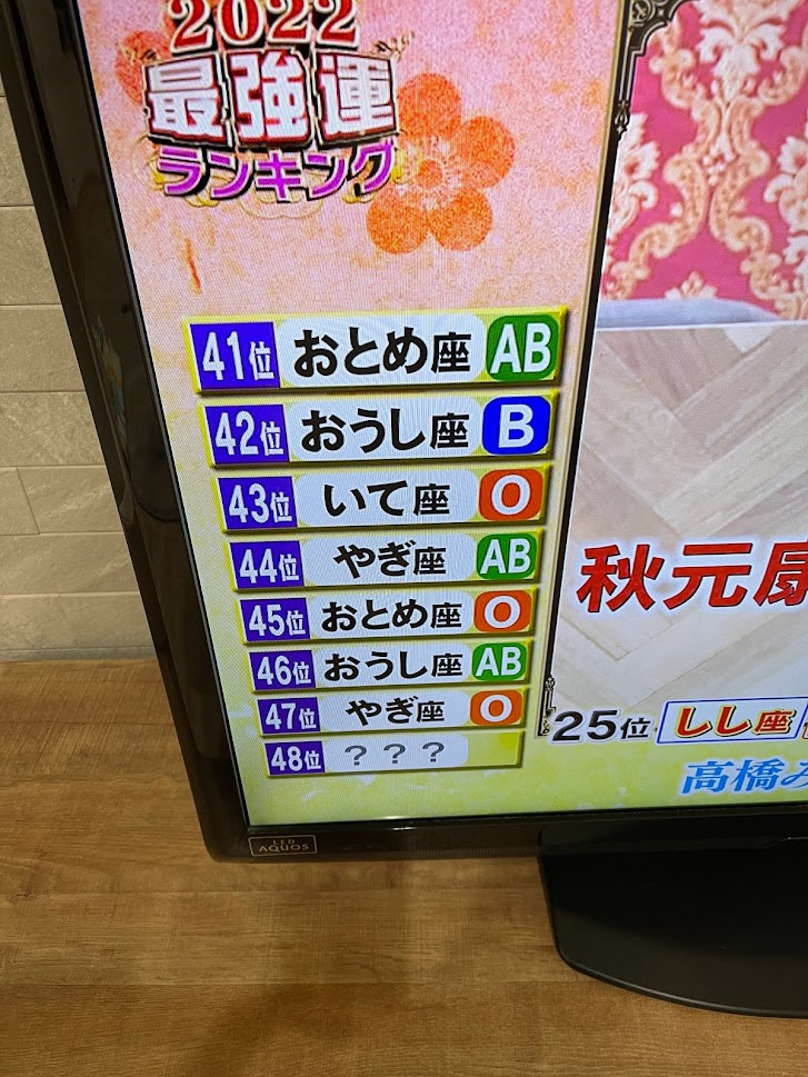 やはり順位を競うとなると、どうしても自分の【やぎ座 O型】が上位にランキングされる事を祈ってしまいます。自分がみた時には40位〜20位のあいだに入っていなかったので、「やっぱり俺って運良いよな〜。多分上位だろうな。」と思っていたらなんと47位でした。苦笑
