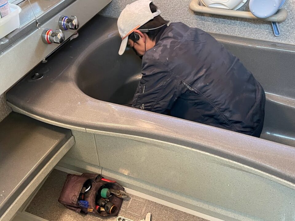 浴槽の循環金具を交換している設備業者さん。これまでの給湯器とは機能が異なるので、こんな工事も必要になってきます。ちなみにこのお風呂は自宅のリフォーム前と一緒のお風呂なので、少し懐かしく感じました^^