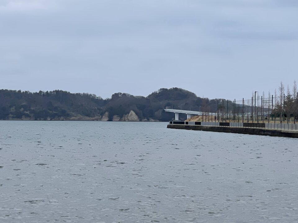 サッカーコートの向こうに見える能登島大橋。サッカーコートでは鵬学園サッカー部が練習してました。めちゃくちゃ人数が多く、県下有数の実力校になったんだな~と実感しました。