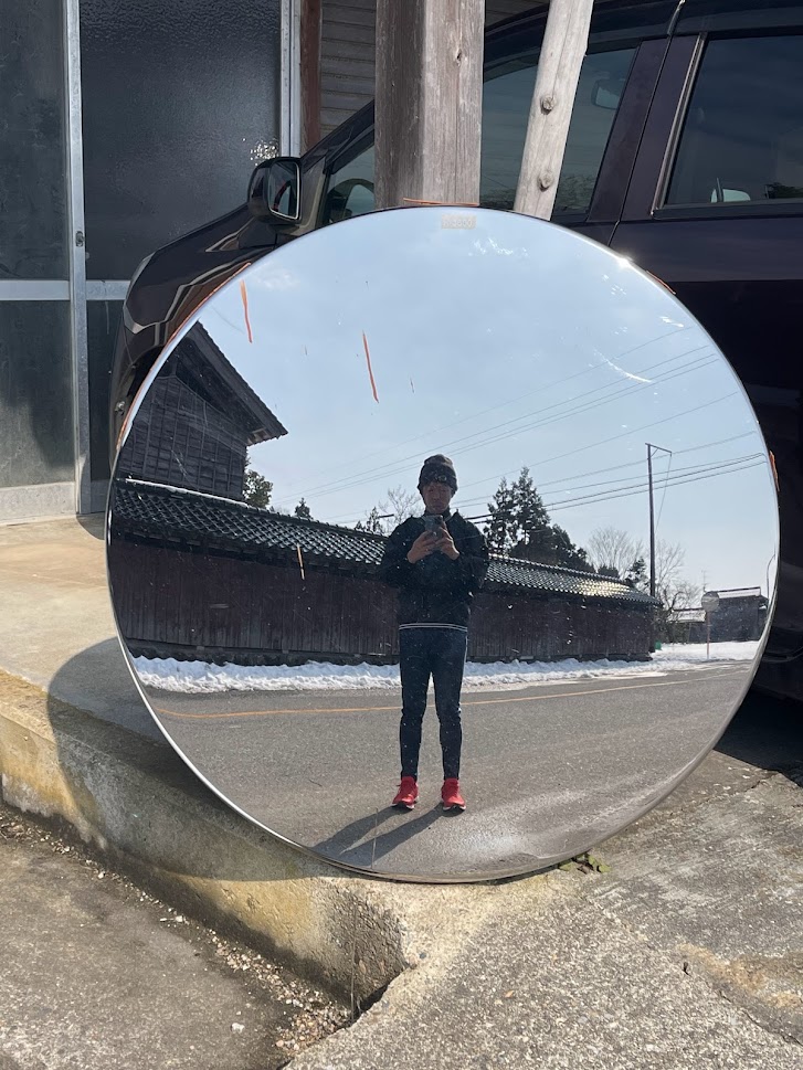 後ろの塀に囲まれた豪邸の方が道路へ出る際に見ているであろうミラーにて撮影