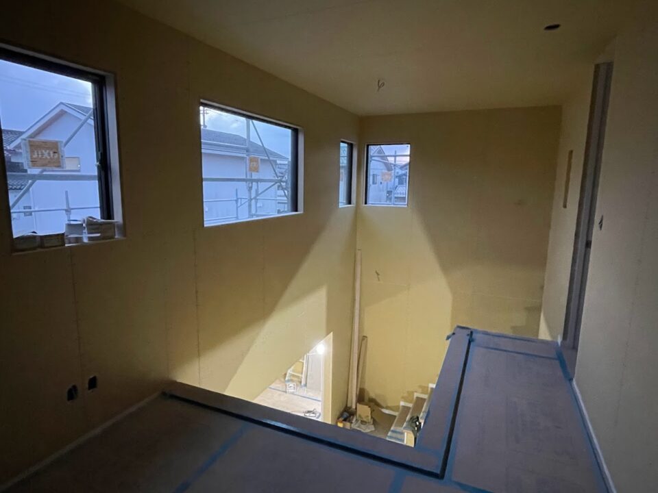リビングの吹き抜け。ここにアイアン手摺が設置されます。いや~完成が楽しみですな~♪