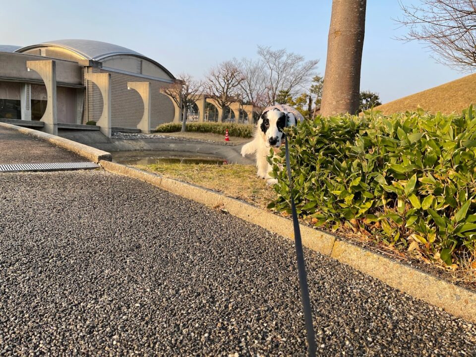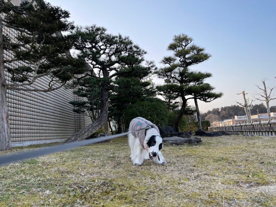 意思の(お酒の誘惑に)弱い飼い主ですが、ロンの散歩は欠かしません。昨日はロンも気分が良かったのか、お仕事終えてからの散歩は近所の美術館まで歩いてきました。