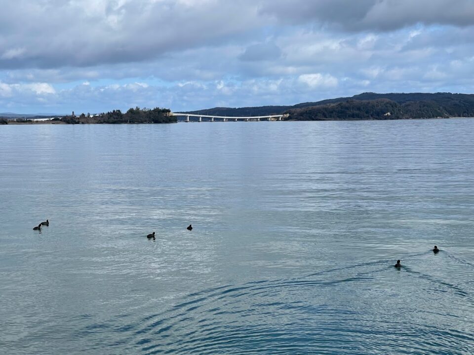 津向町付近の海岸線の道路。写真を撮ろうと海に近づいたら鳥たちに逃げられちゃいました。休憩してたのにごめんやで!笑