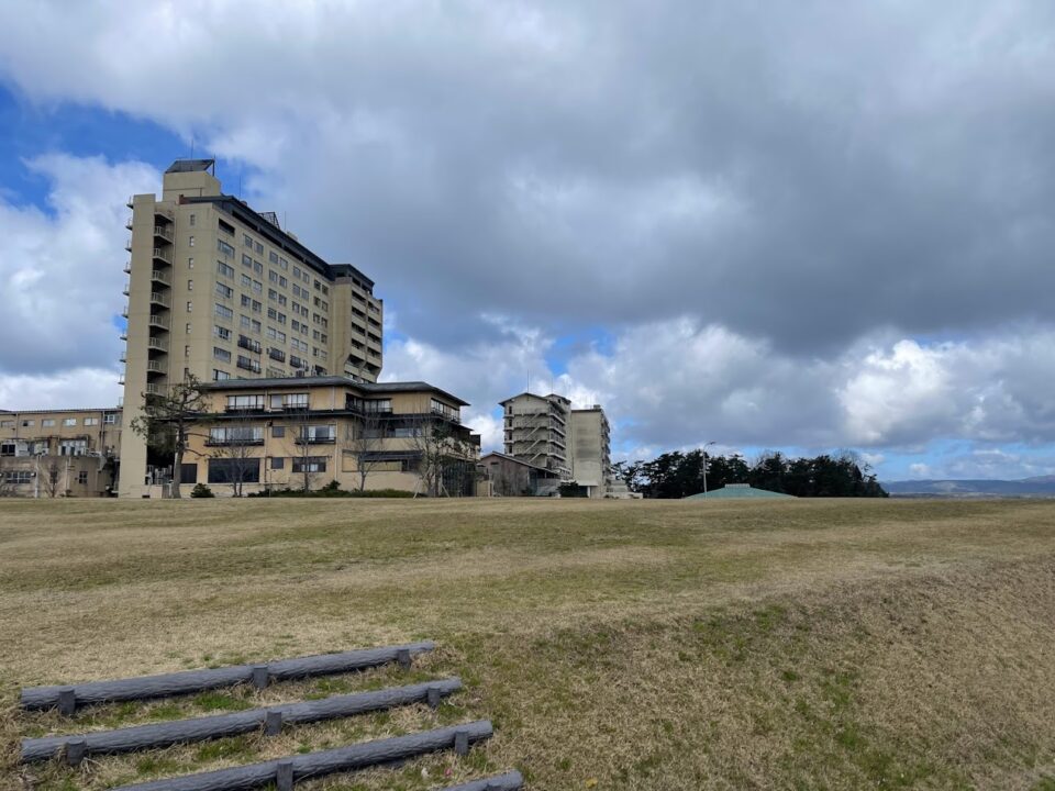 サッカー場(右)と長閑な七尾湾