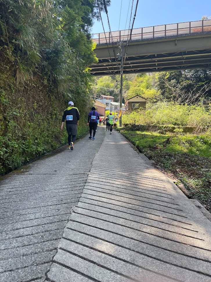 急勾配の無理な坂。ここで脚力を使い切る訳にはいかない!と歩いて上ります。でも、登り切ったあとの下り坂で「さぁ、走ろう」と思ったら太ももが限界に近づいてました。苦笑