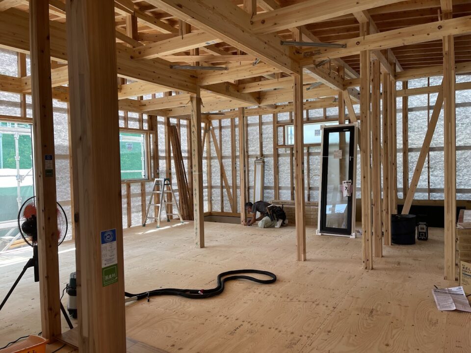 ここから1週間の後には床仕上げ材が張られて、断熱材がびっしりと施工され、外壁下地もほぼ仕上がってました。はやー。