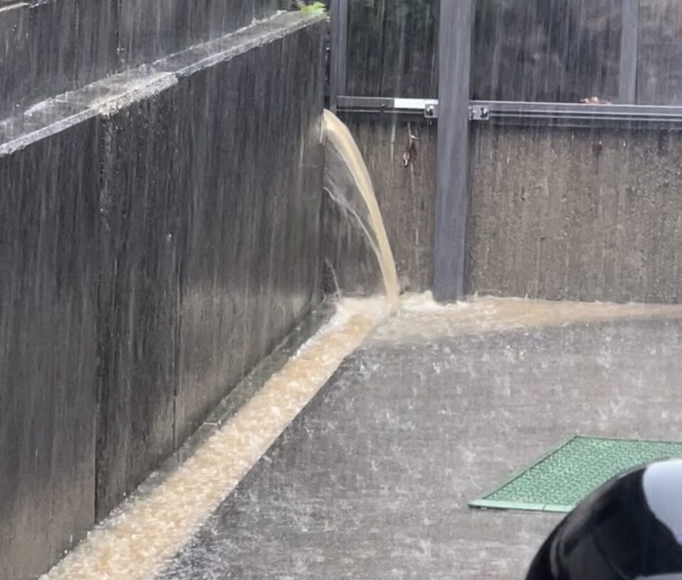 それは、我が家の敷地より高い後ろの畑から泥水が大量に流れ落ちてきているところでした。水だけならまだしも土混じりなので、気分的に良ろしくありません。。。水の流入が収まってコンクリートが乾いたら表面が茶色くなりますしね。