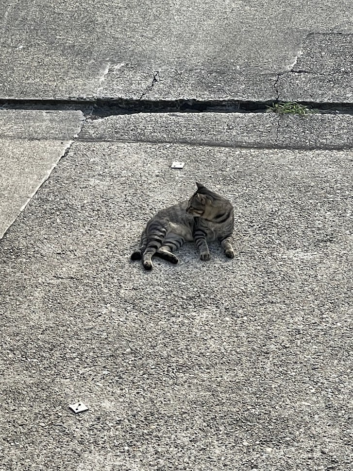 この前は会社下の駐車場へいくスロープでひなたぼっこをしている姿を見かけました。犬もいいけど、猫もやっぱり可愛いですね~。特にキジトラは好きです♡