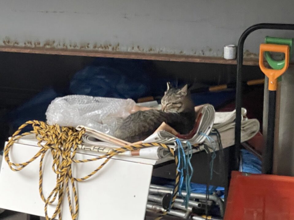 昨日、帰宅の際に事務所を出たら、近所の猫ちゃんが現場シートの上で毛繕いしているところに遭遇した 明星光紀(あけぼしみつのり) です。