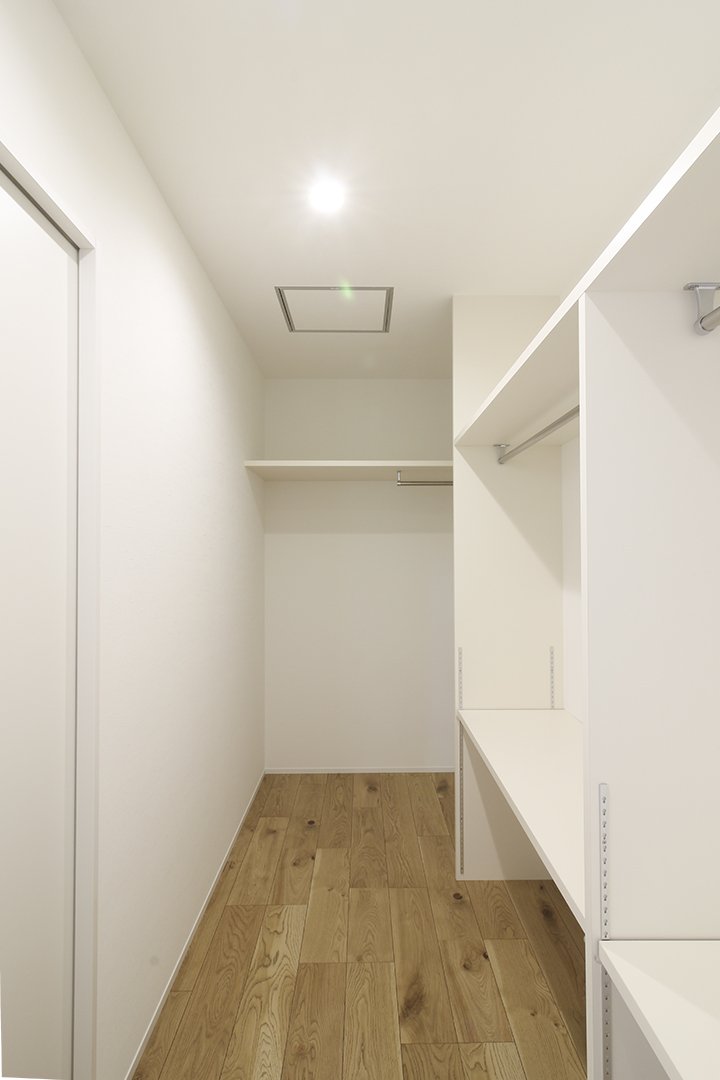 そんな中、普段は寝室と一対で配置される事が多いウォークインクローゼット(以下:ウォークイン)が寝室とは離れて、廊下をはさんだところに配置されていました。