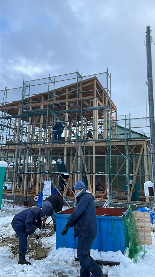 お昼休憩前には2階も組みあがり、屋根組みに着手するまで作業はすすみました。はやー。ちなみにボクは2階の床板が張られた時点で1階床下に溜まってしまった雪をエッチラホッチラと掻き出していました。いい運動になった~。