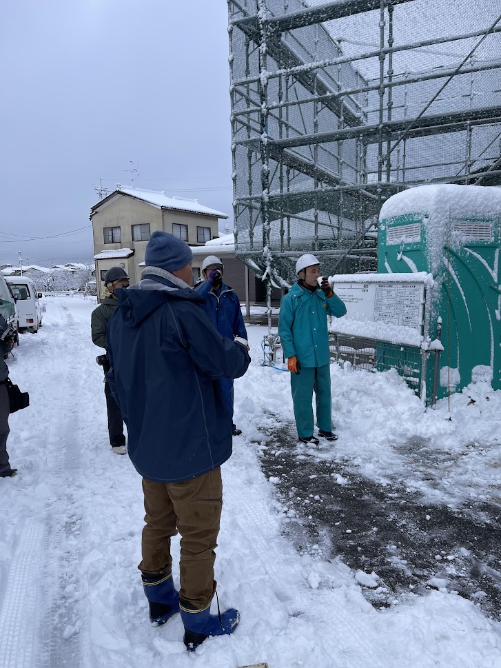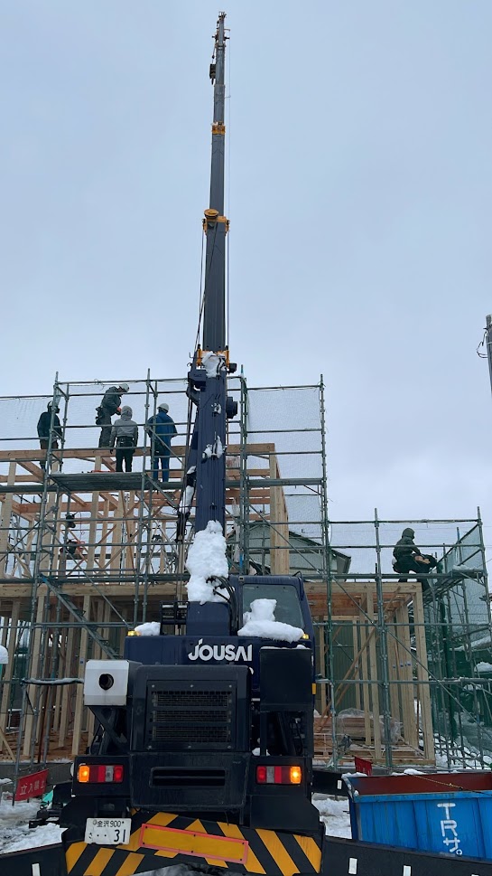 実は12月には4軒の上棟作業がありました。12月はどうしても天気が悪い日が多い中で、1軒だけ天気の素晴らしい日があったのですが、それ以外は雨。4軒のうちの最後の上棟の昨日は前夜未明から降った雪で一瞬中止も頭をよぎったのですが、とにかく大工さんや広崎と相談しようと思って早めに自宅を出たのでした。