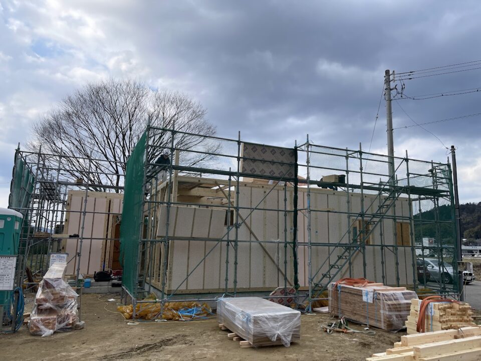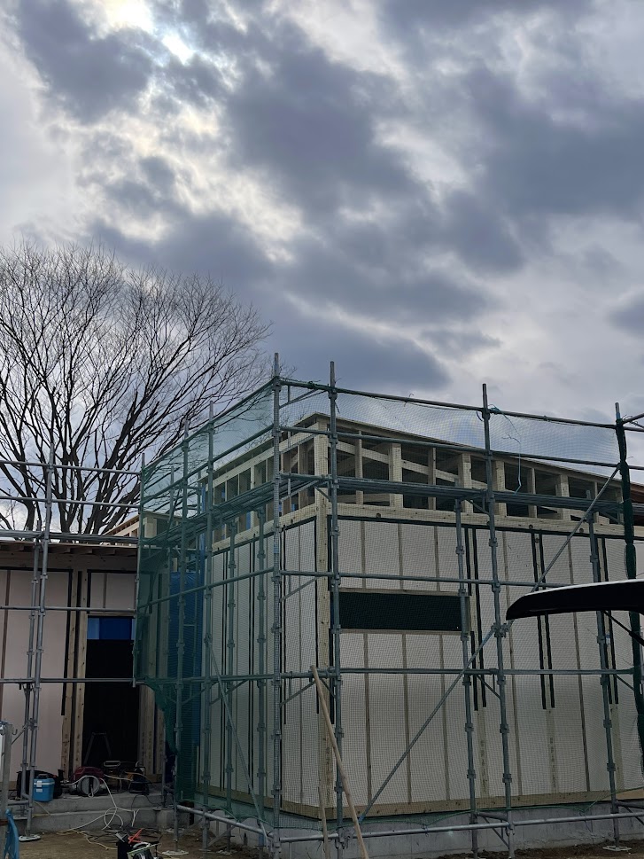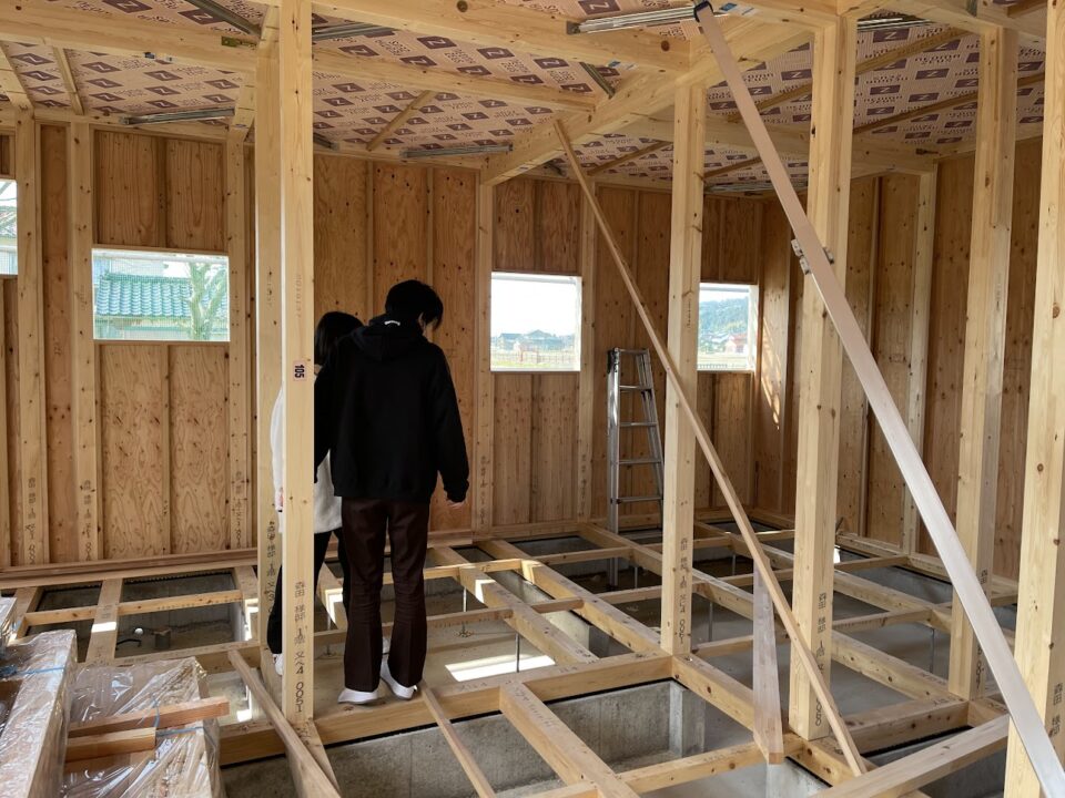 今回はプレウォール工法を採用。お家が壁で囲われるともう完成したかのように感じますね~。