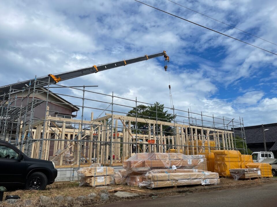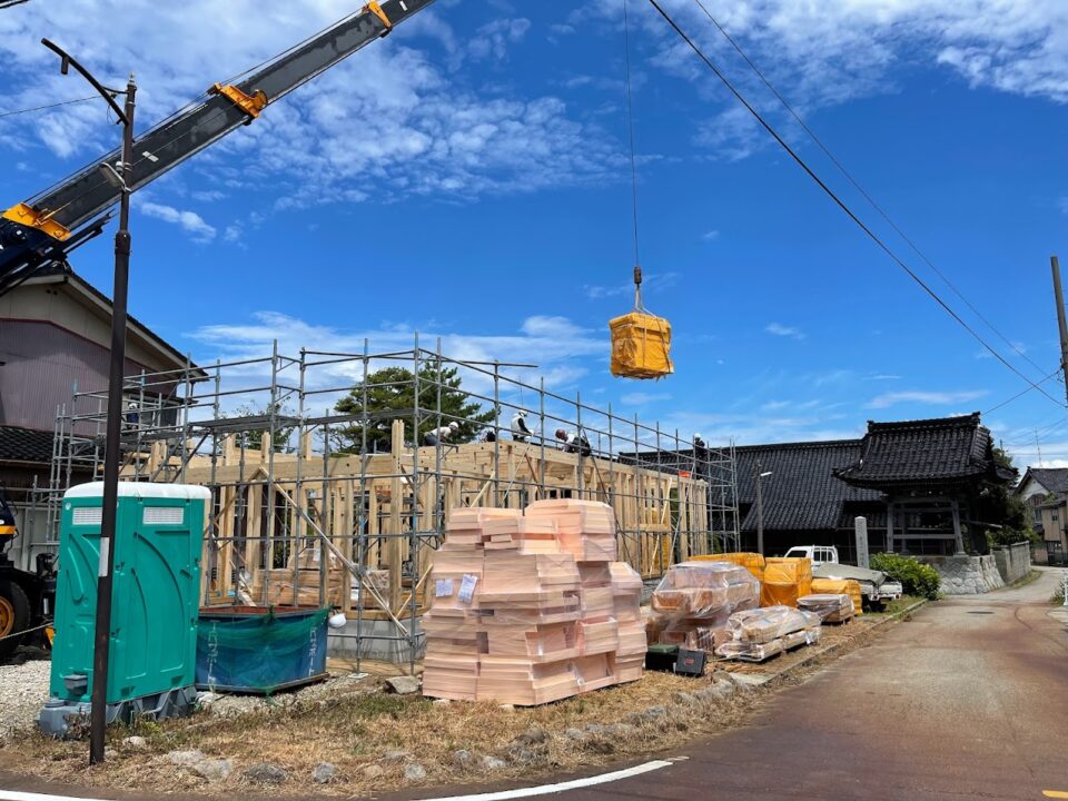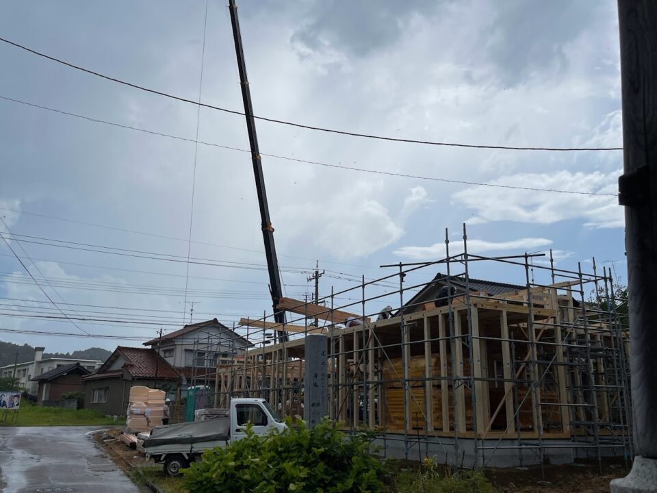3日前(7日)の月曜日、宝達志水町にて平屋のお家の上棟作業がありました。当日の天気予報は曇りでしたが、予報通りにはいかずカンカン照りの酷暑・・・そんな中大工さん方はいつも通りに頑張ってくださいました。大工さん方、本当にありがとうございます!!