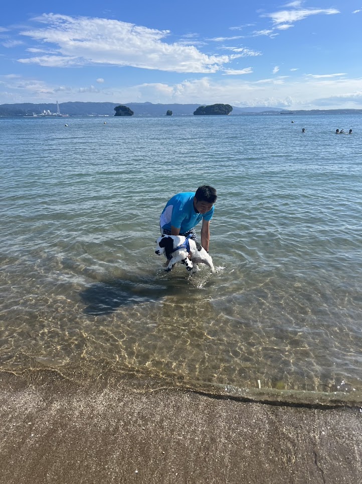 浅瀬だとあかん!と判断し、沖の方へとロンをつれていき、下から体を支えながら水に浮かべてみるとバタバタと犬かきをはじめました。(本人は嫌がっているというか必死だったんだろうけど。笑)