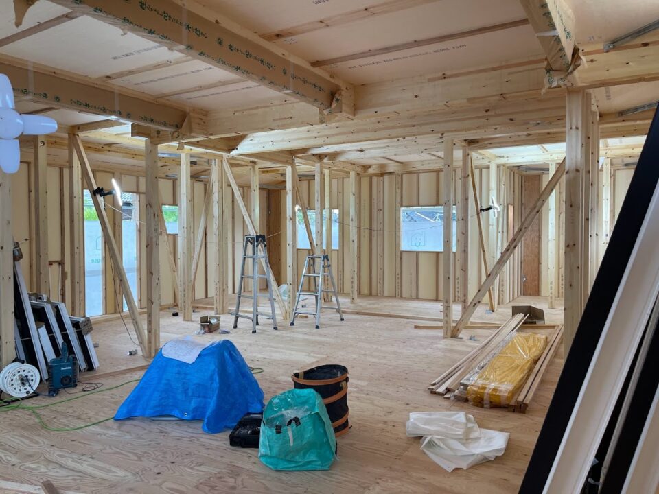 8月7日に上棟した【宝達の家】。現在は窓が取り付けられて、大工工事、電気工事が進行中です。