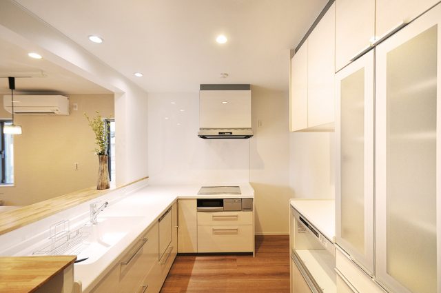 キッチンは最も家事動線が良いL型を採用。右手に見える食器棚の後ろに壁を挟んで大容量のパントリー兼収納があります^^