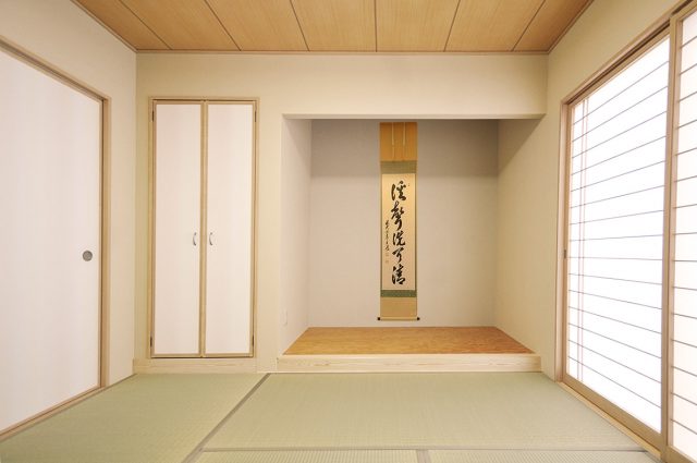 家族団欒のスペースであるリビング。フローリングにソファというスタイルも良いですが、N様には、よりリラックス出来る床材=タタミをご提案しました。