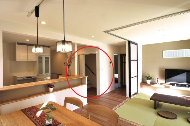 2階へ行くときには必ずリビングを通らないといけません^^ちなみに冬場は暖かい空気が2階へ行くのを防ぐために階段への入り口には引き戸を設置しました♪