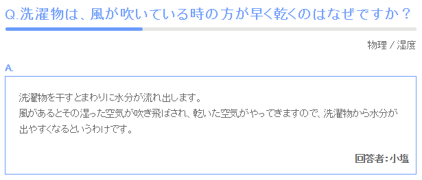 で、伊藤の意見【風が洗濯物を乾かす】が生きてくる訳です。早速、伊藤の意見は考え方として合っているかどうかググってみました。するとこんな情報が!