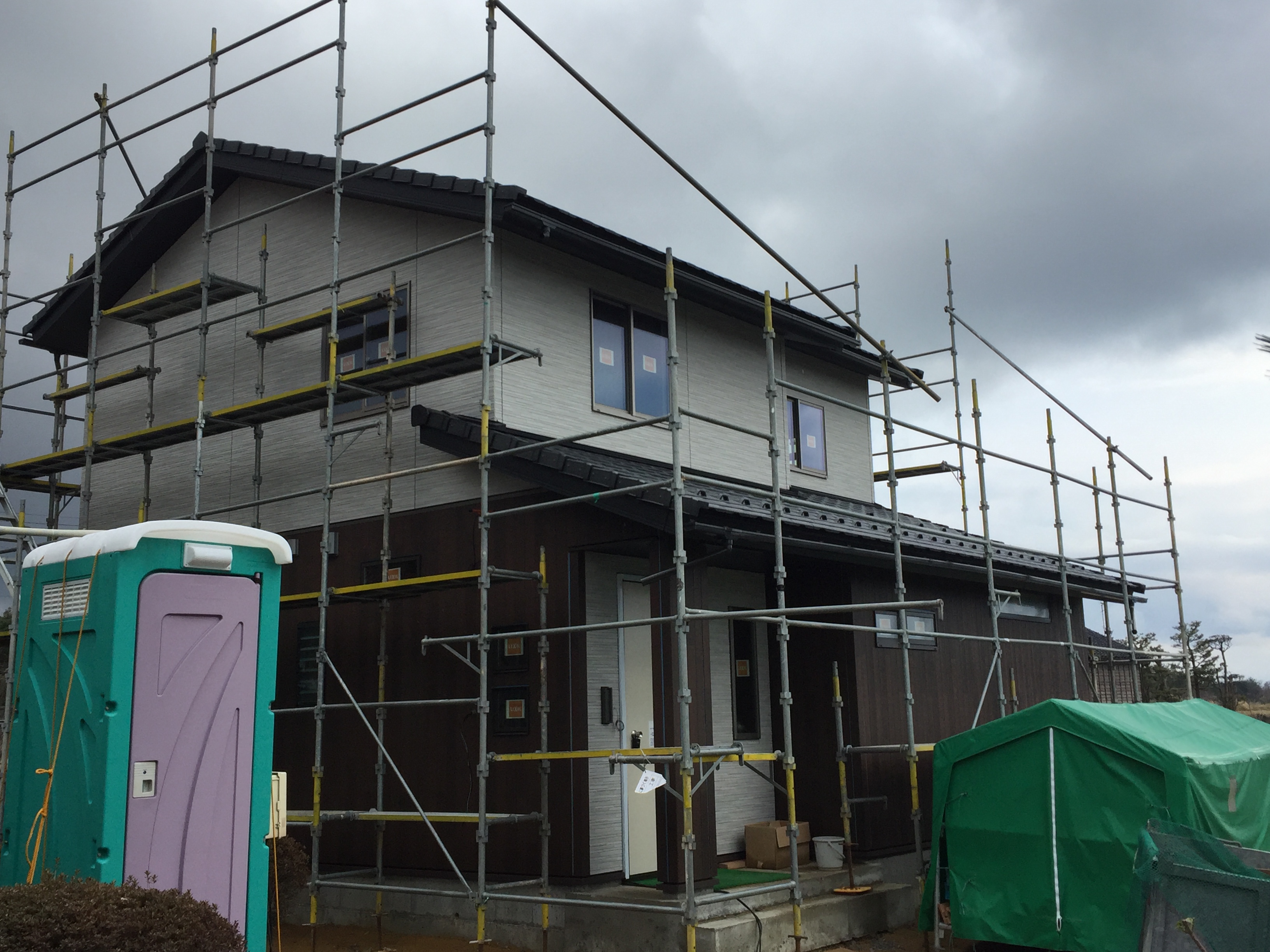 例えば、現在工事中の志賀町K様邸。1階と2階の外壁の色が違います。窓の枠を目立たせなのがデザイン的にスッキリするとボクは思っているので、窓枠の色を1階と2階で変えました。