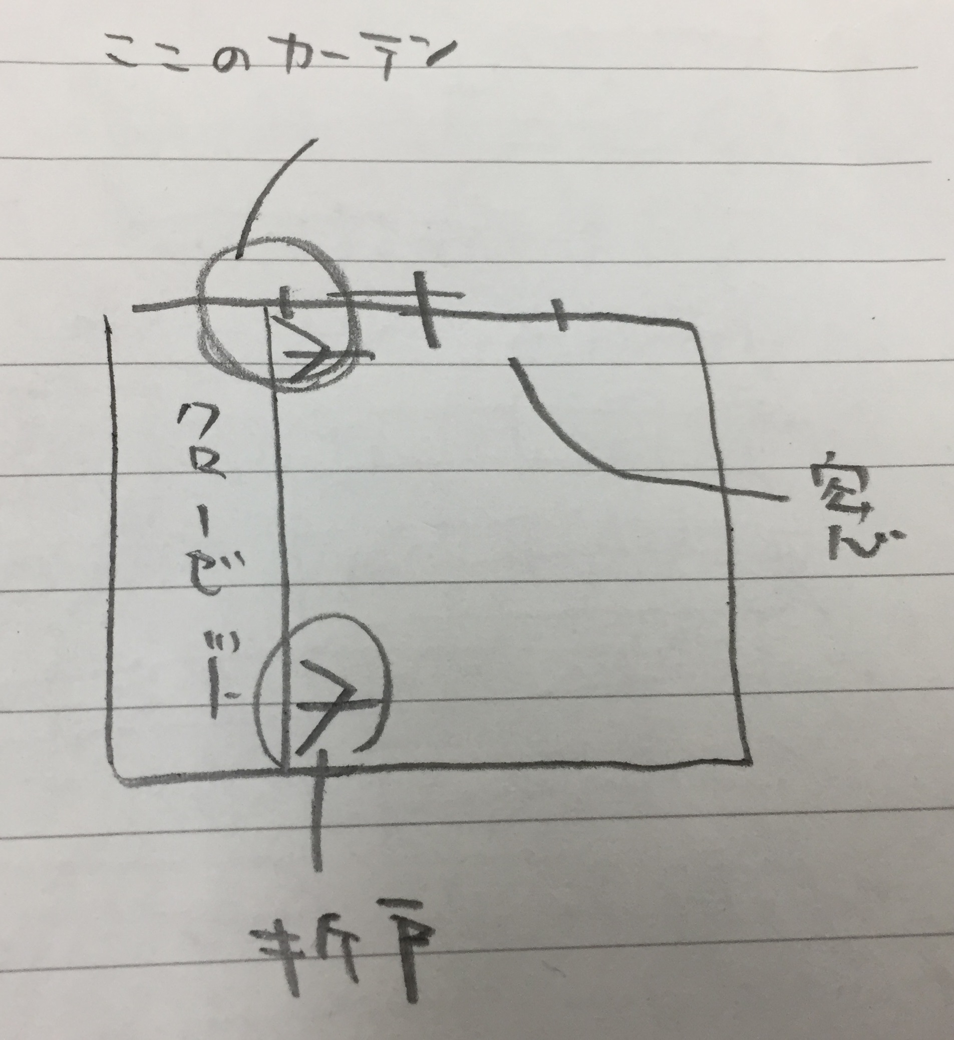 これは上から見た図。窓(カーテンレール)とクローゼット扉が近すぎると、クローゼット扉が開かなくなります。。。