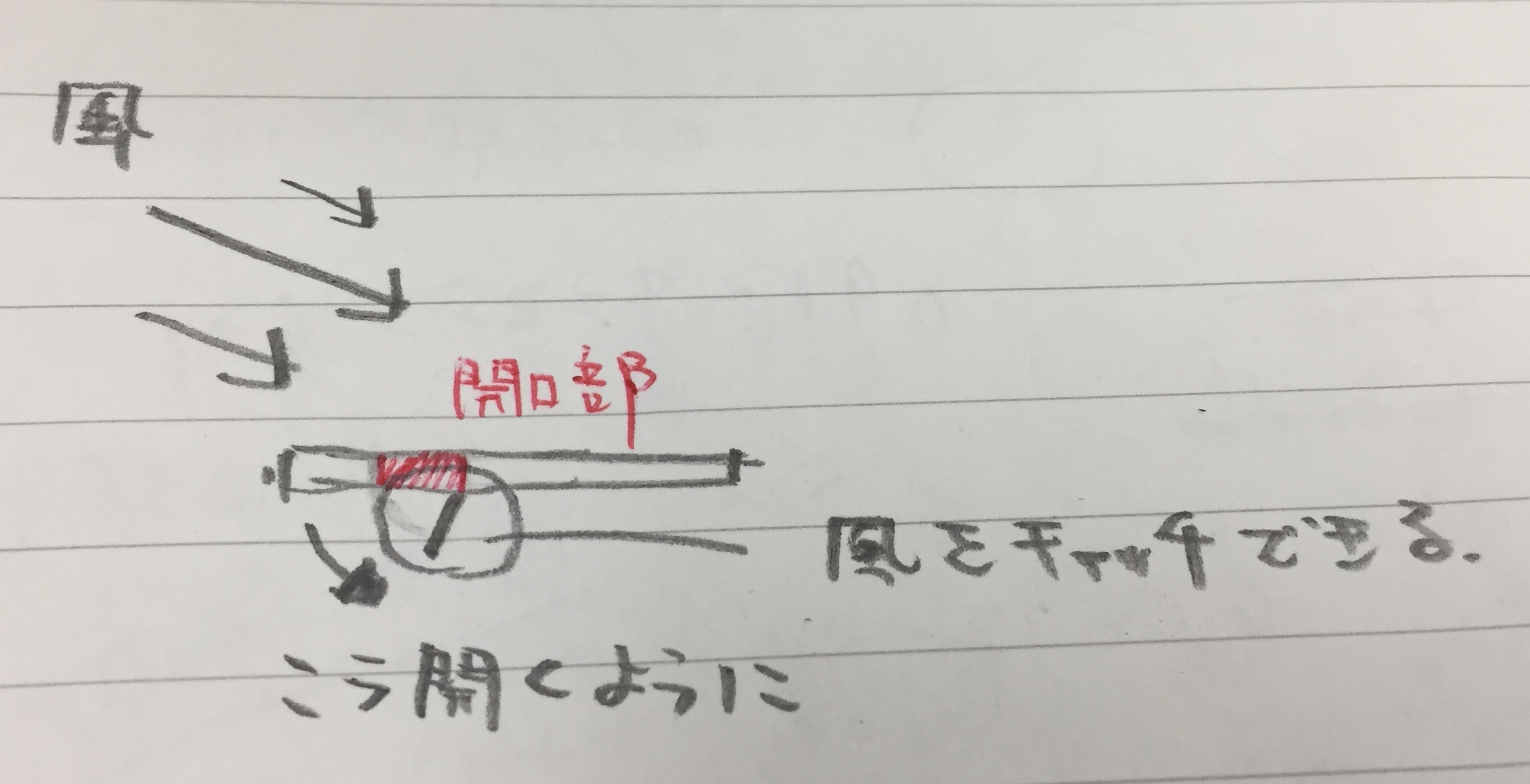 でも、一つだけ注意して欲しい事があります。それは、できるだけ吹いてきた風をキャッチ出来るような(開口部分の)開き方をして欲しいって事です。