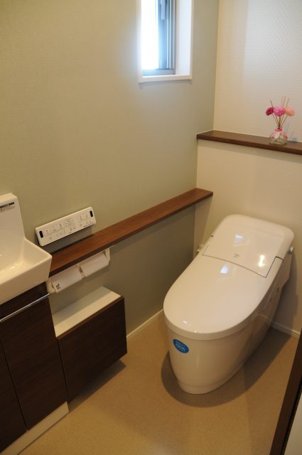 照明にはモノをハッキリ照らしてくれる白(昼白色)と温かみのあるオレンジっぽい色(電球色)があります。やはりゆったりとした気持ちで過ごしたいところでは後者を選ぶのが理想ですので、トイレには後者を選択しました。空間も柔らかく演出できるのでオススメです^^