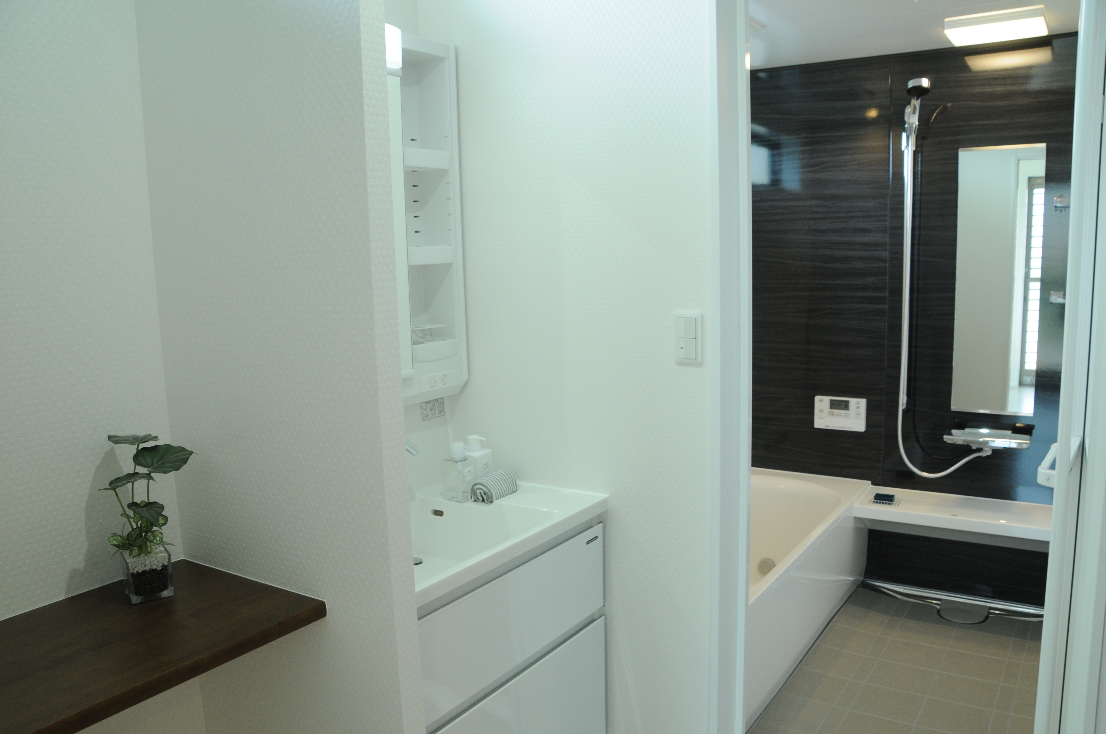 ダイングスペースから出入り出来る水廻り。(洗面脱衣室、お風呂、サンルーム)洗面所横のカウンターは着替えやバスタオルをおけたりと使い勝手が良さそうです♪