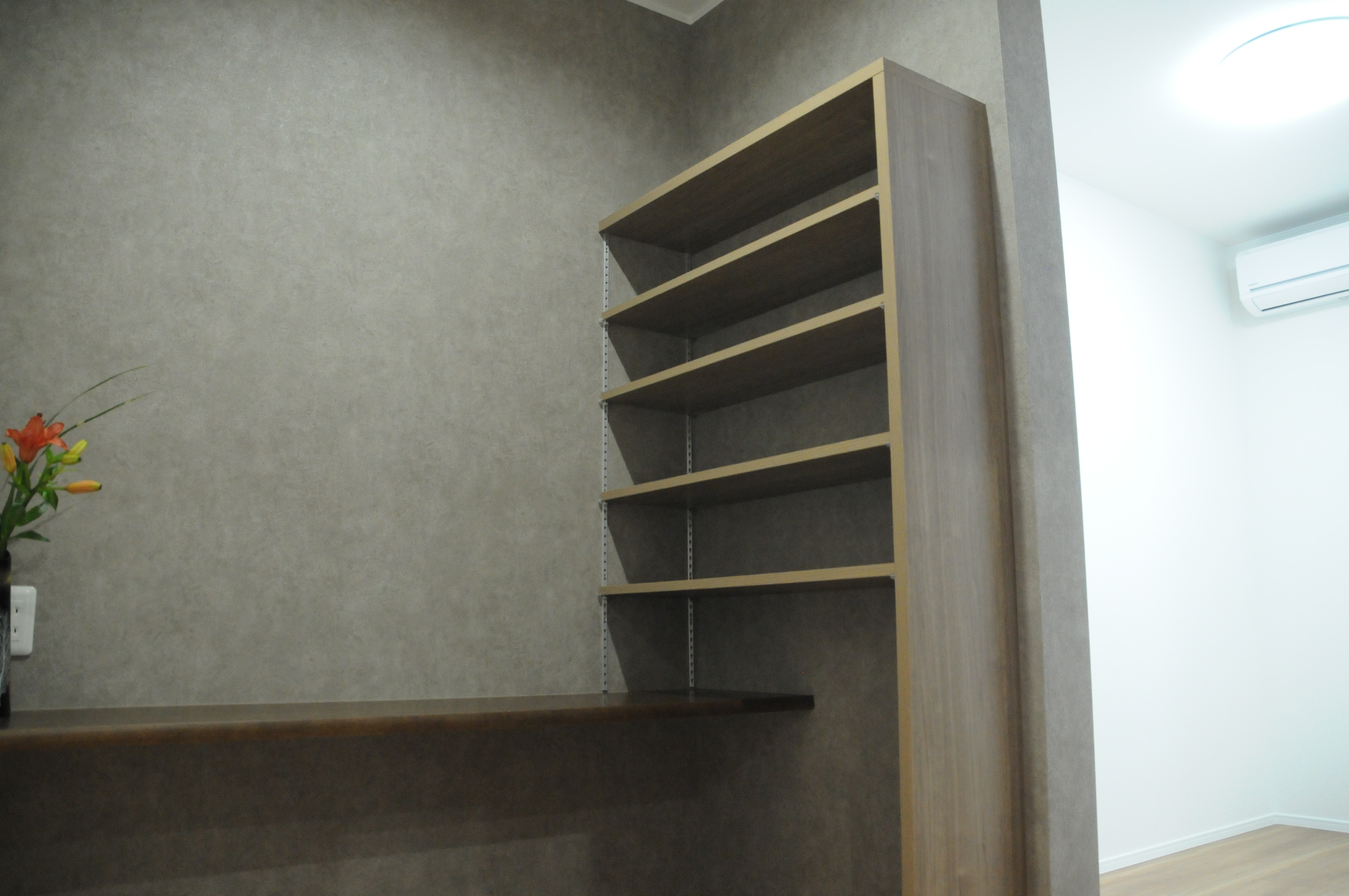 内装にはデザイン面や機能面(調湿・防臭効果等)で優れているエコカラット(タイル)を壁に張ったり、ボクのこだわりでLDKの一角に飾り棚を作らせてもらったりさせて頂きました。