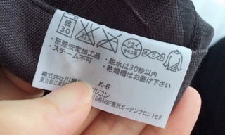 このタグの場合、マークを見る限り水温は30℃以下で弱水流(一番左のマーク)で洗って下さい。っていう意味です。タグにも書いてありますが、脱水は30秒以下なので、全自動とかで洗う際にも脱水時間には注意してくださいね。(脱水時間が長いとシワになってしまうかもしれません。)