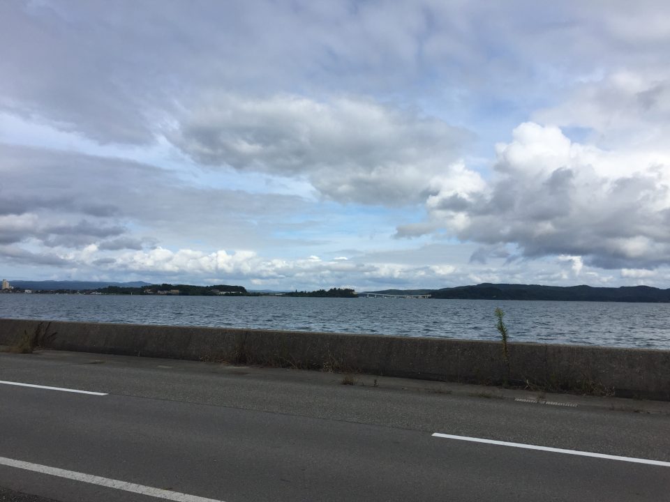 七尾の街中を過ぎて和倉温泉に向かう途中、海岸線をひた走ります。昨日はちょっと曇り空でしたが、天気が良いとすごく綺麗に海が見えるスポットです♪