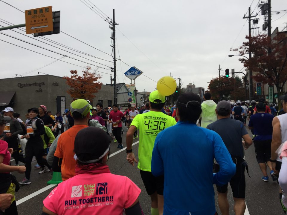 スタートから約40分。4時間半のペースランナーに追いつかれました(汗)ここでペースランナーに置いていかれるのもアレなので、ペースランナーに群がるランナーと一緒に距離を刻んで行きます。