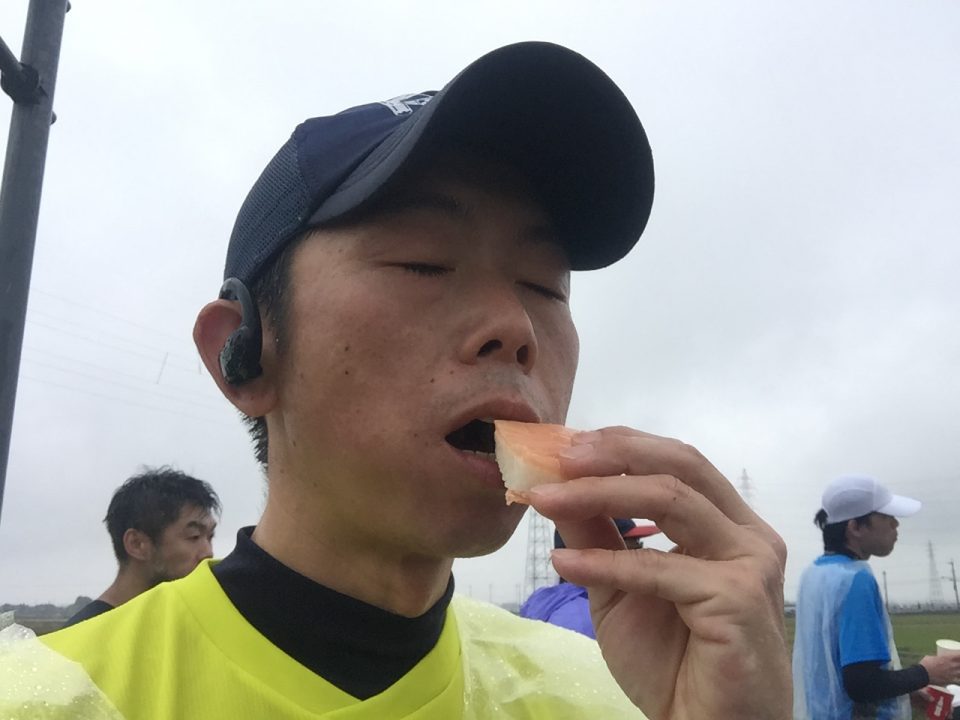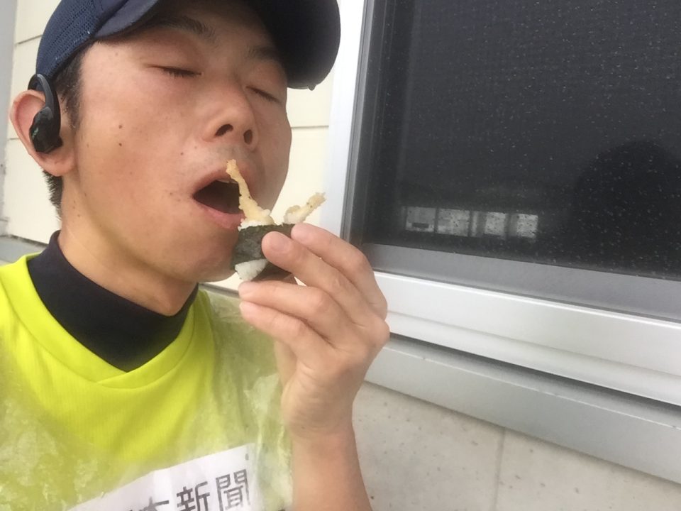 キツイ時間帯をなんとかクリアし、32km付近で現れたエイドでますの寿司をゲット^^