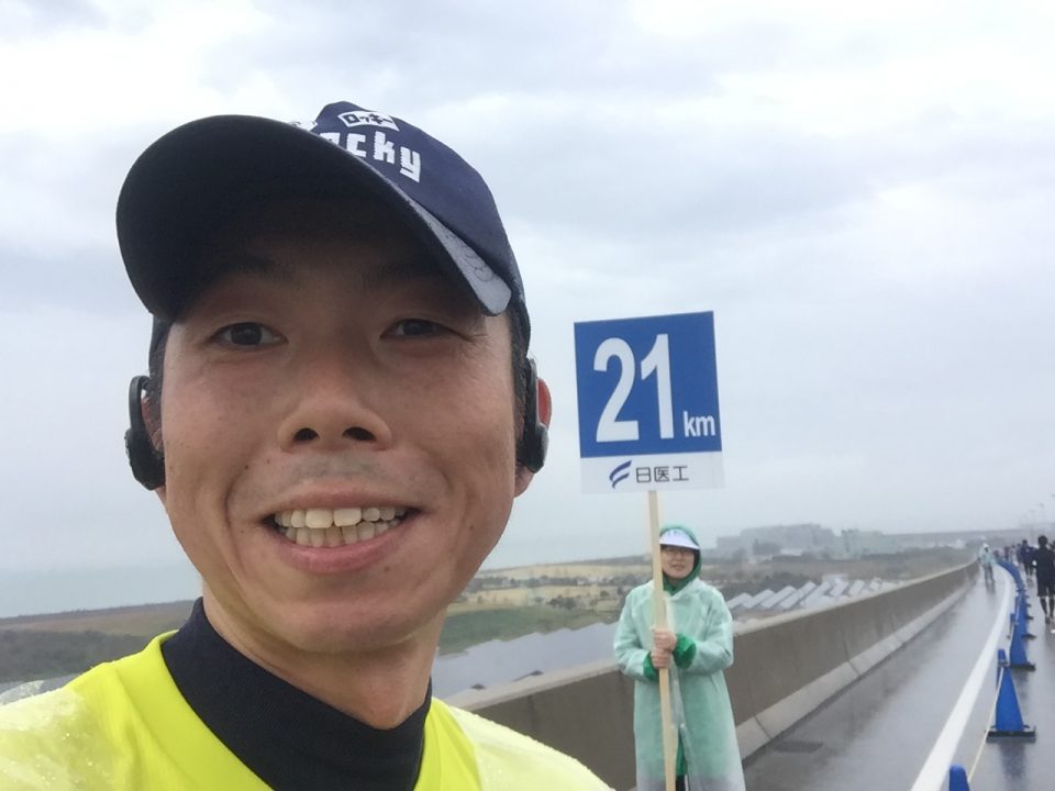 絶望感を感じながらも走らないとゴールは近づいてこないので、新湊大橋をあとにして、これまた続く長い直線をひたすら走ります。いや〜マジで20km〜30kmくらいまでキツかったー。