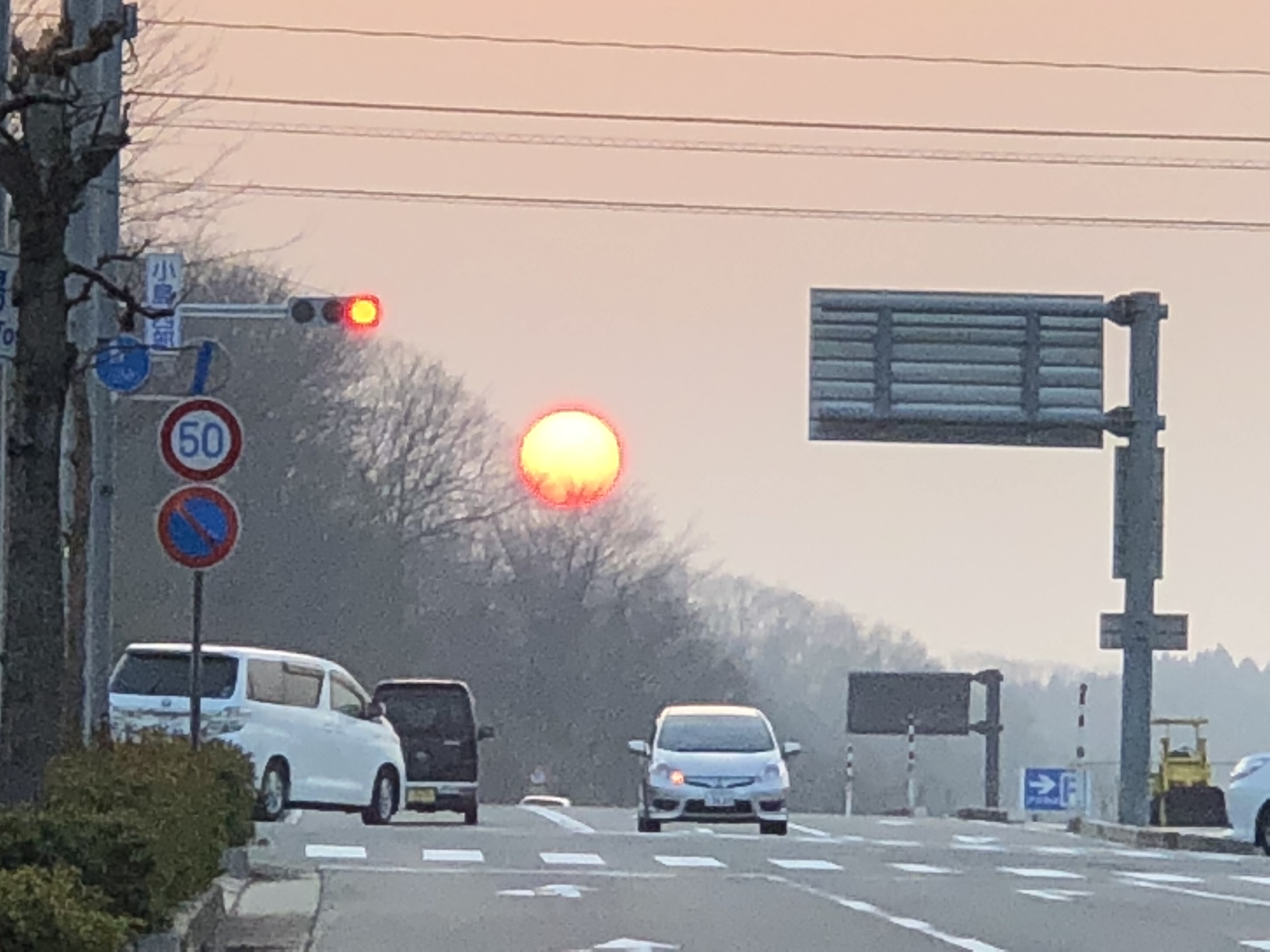 以前、帰宅の際に見かけた大きな夕陽。当たり前ですが、西日です。