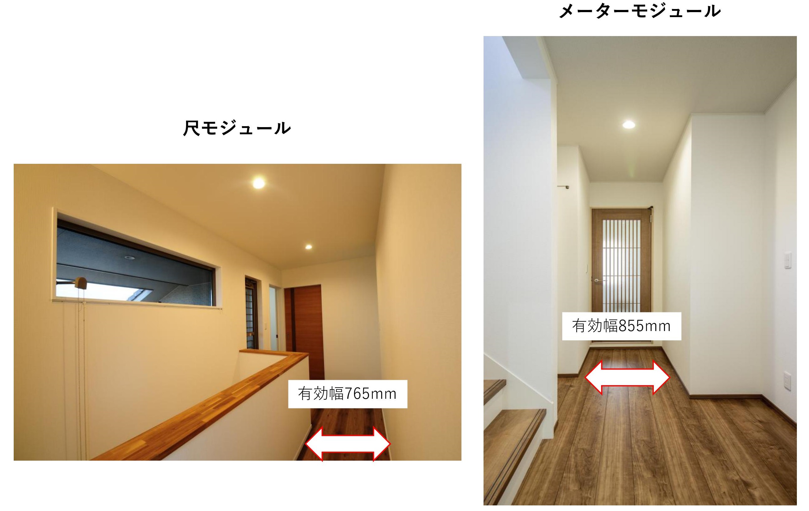 この理由につきます。工場で生産される建材の多くは尺を基準に作られています。沢山作られるという事は生産上のコストも抑えられるし、在庫も豊富なのです。一時は弊社でも尺からメーターに基準寸法を変えた事がありましたが、今では3/5くらいまで尺モジュールに戻ってきました。(参考までに尺で廊下や階段は幅広にしたい場合は3尺5寸(1062mm)という寸法を採用します)