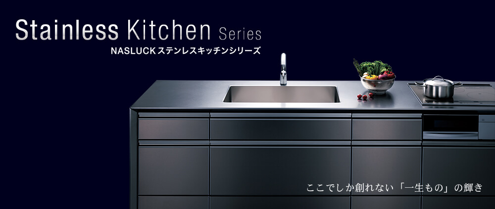 木製は木(建材)で組んだキャビネットに引き出しやワークトップカウンター(シンク含む)を肉付けしていく商品なのに対して、ステンレスは枠は木で組むものの、目に見える収納内の壁・床・天井はすべてステンレスで囲まれたものをさします。