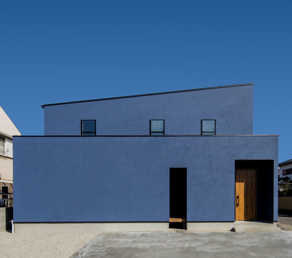 最近多く採用されているのは片流れ屋根。瓦は傾斜角度が強め(最低約17°)でないといけないのに対して、GL鋼板は緩い勾配(6°程度)でもつくれるからです。下の写真をみてもらえばお分かりになると思いますが、緩い勾配だと外観フォルムが整うのにたいして、傾斜角度が強いと水上の屋根が上がりすぎてしまい、フォルムを整えるのが難しくなります。