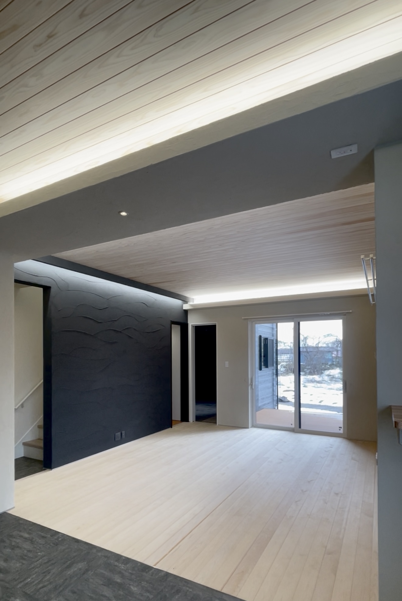 素足で歩ける床には自然素材(能登ヒバ)、壁は珪藻土塗り壁、天井は杉羽目板を採用。