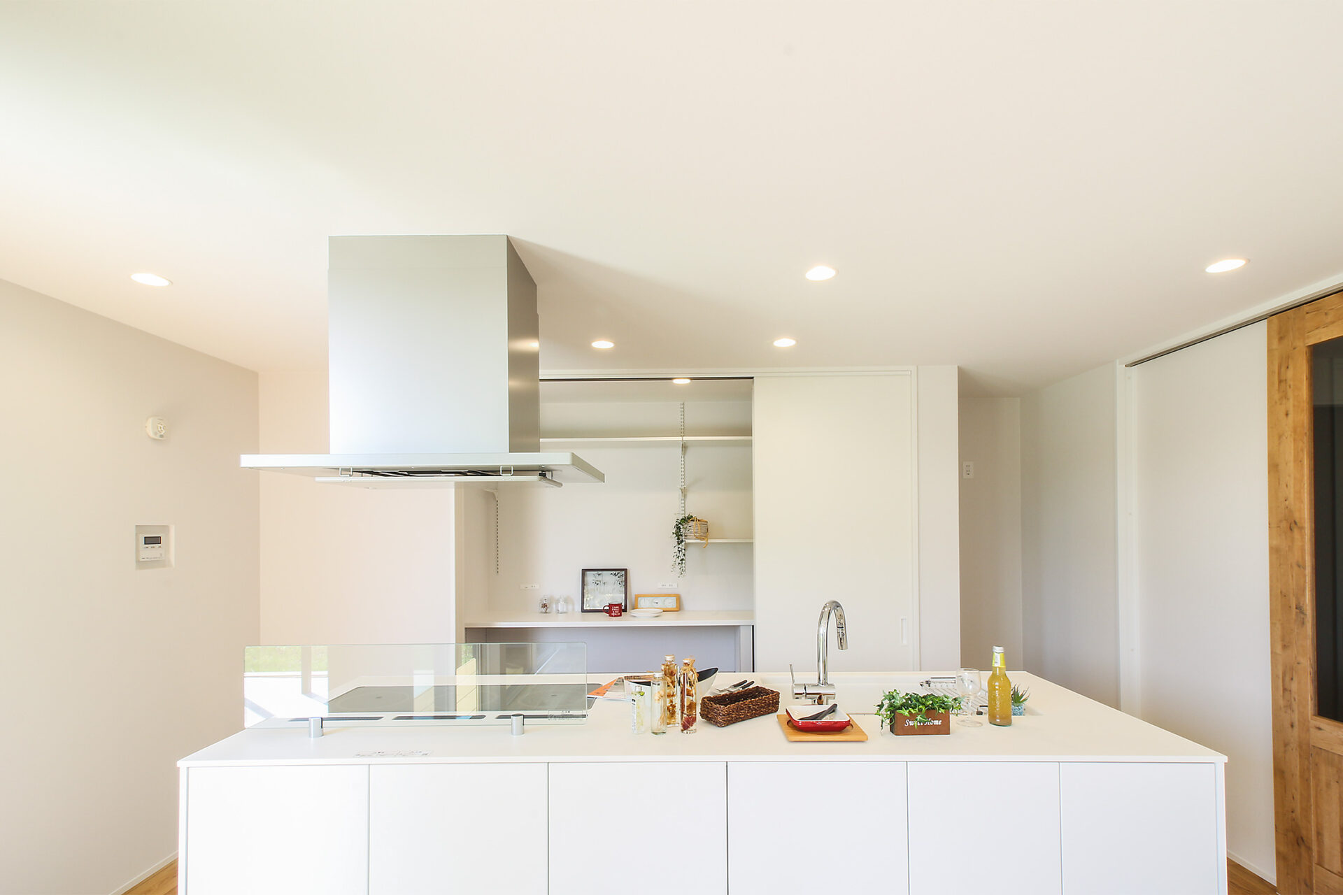 食器棚はパントリーを兼ねて壁一面の収納を採用