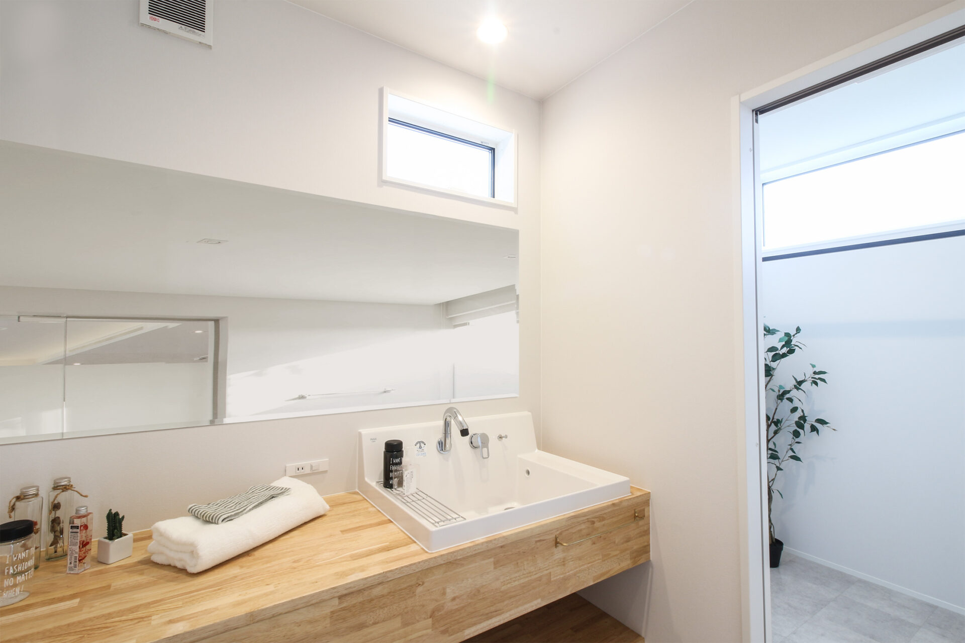 洗面ボウルは既製品のメリット(水はね対策等の使いやすさ)を活かし、LIXILのピアラを採用。朝の渋滞がおきないように幅広の造作カウンターに乗せました。