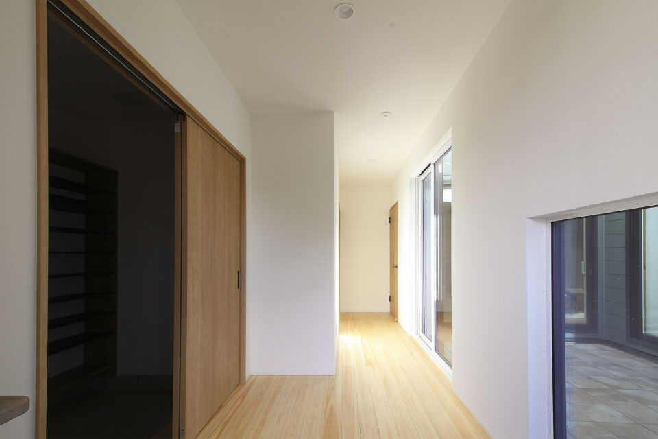 玄関から入ってすぐ左手にシューズクローク。右手には中庭へと視線が抜ける位置に窓を設置し、明るい玄関になっています。