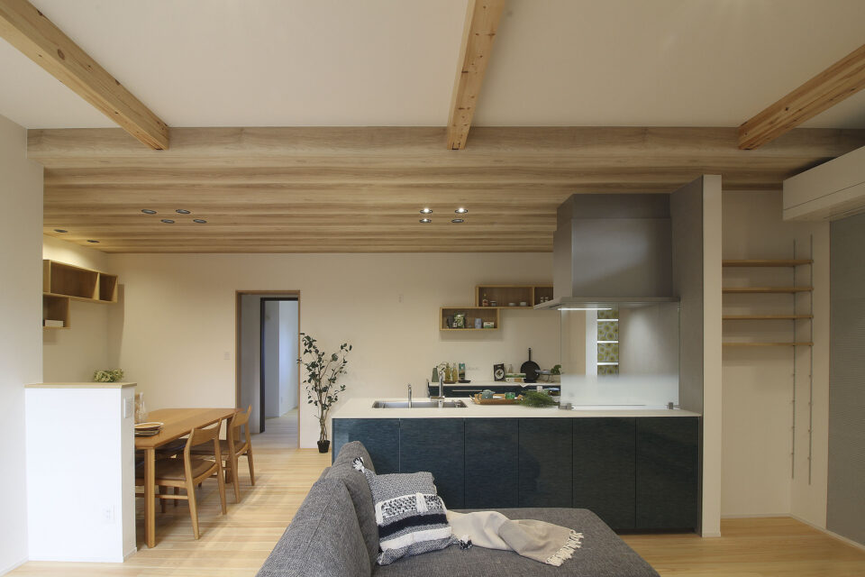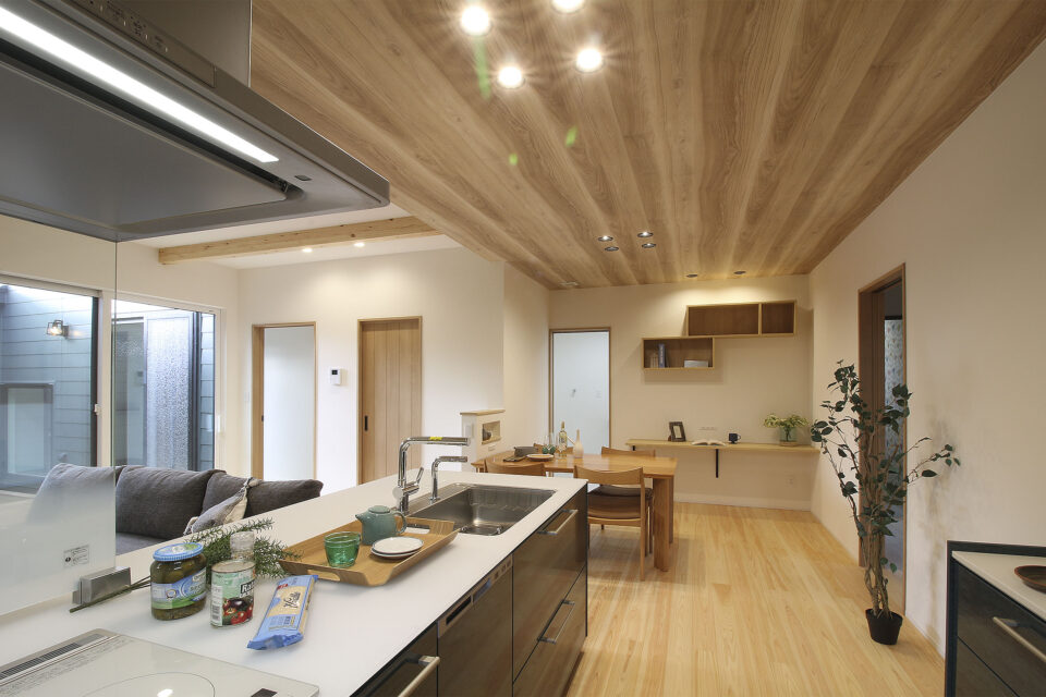 LDKをより広く感じれるようにペニンシュラキッチンを採用。