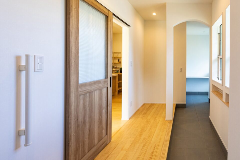 アール壁の垂れ壁で優しい雰囲気の玄関