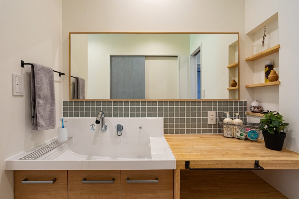 ワイドミラーで忙しい朝もストレスフリーで使えるのが魅力的。グレーのタイルでアクセントを付けました。