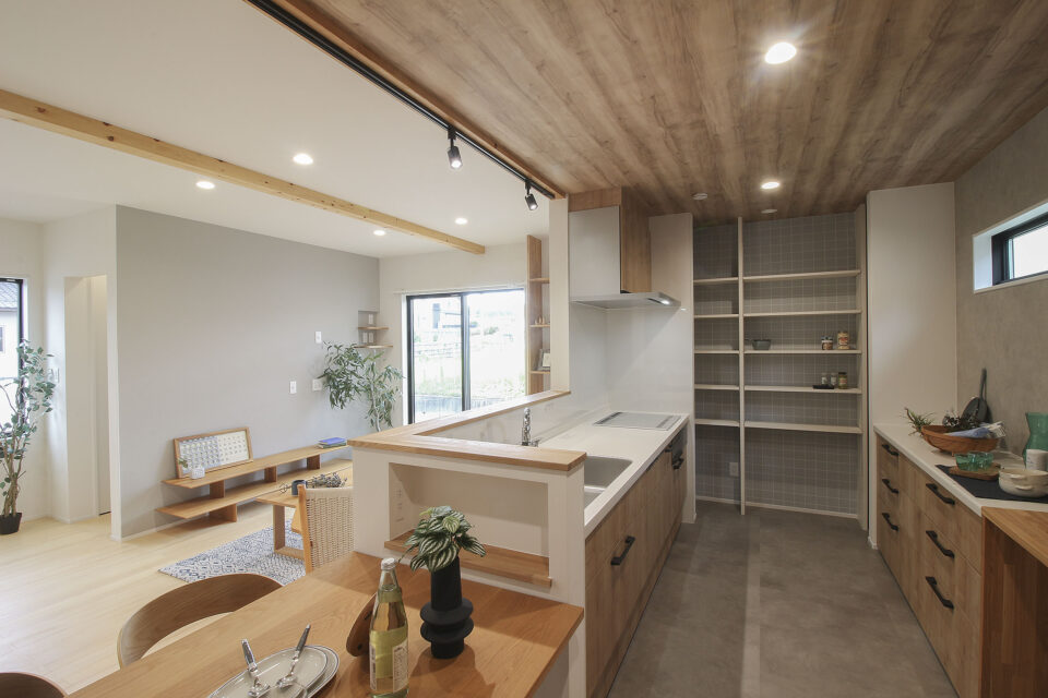 天井や壁、床のトーンを合わせグレー×木目の色バランスも良いキッチンに仕上がりました。